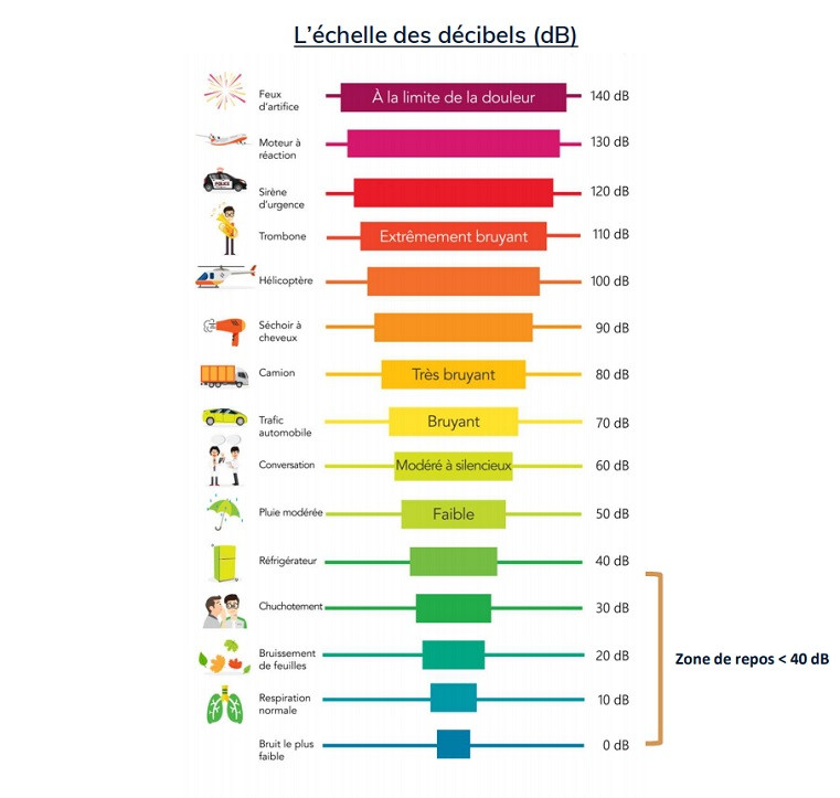 L’intensité des sons est exprimée en décibels dans une échelle allant de 0 dB(A), seuil de l’audition humaine, à environ 120 dB(A), limite supérieure des bruits usuels de notre environnement. Le niveau sonore recommandé dans une habitation pour se reposer est d’environ 40 dB.